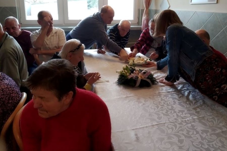 Wielkanoc to najważniejsze i najstarsze święto chrześcijańskie, obchodzone w Polsce już od X wieku. W ten wyjątkowy czas podczas zajęć terapeutycznych rozmawialiśmy o tradycji świątecznej i jej kultywowaniu oraz o znaczeniu i symbolice świąt. Mieszkańcy dzielili się swoimi wspomnieniami o tradycjach związanych z obchodzeniem świąt w ich domach rodzinnych oraz wykonywali różnego rodzaju rękodzieło – stroiki, dekoracje oraz pisanki, które ozdobiły nasz Dom. Z okazji Wielkanocy spotkaliśmy się dwukrotnie, by złożyć sobie życzenia i wspólnie spędzić czas. Wśród nas zapanowała świąteczna atmosfera, a na odświętnie udekorowanych stołach zagościły: babki, mazurki i inne świąteczne smakołyki. Zgodnie z tradycją podzieliliśmy się święconym jajkiem, życząc sobie: zdrowych, radosnych Świąt, pełnych spokoju i radości. Niech Święta Wielkanocne przyniosą wszystkim uśmiech, wiosenny optymizm oraz wzajemną życzliwość.