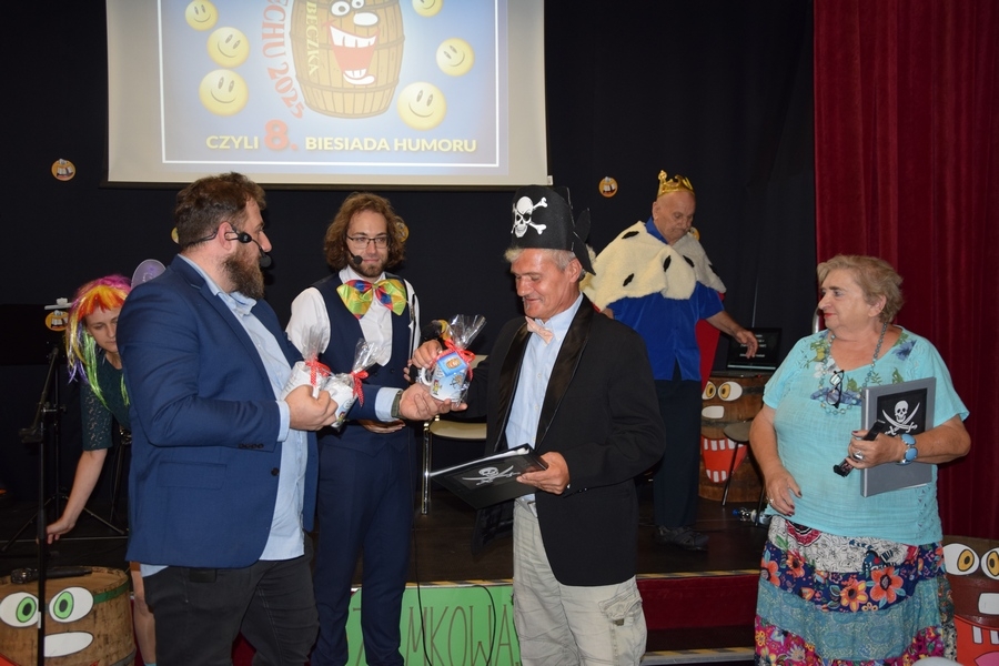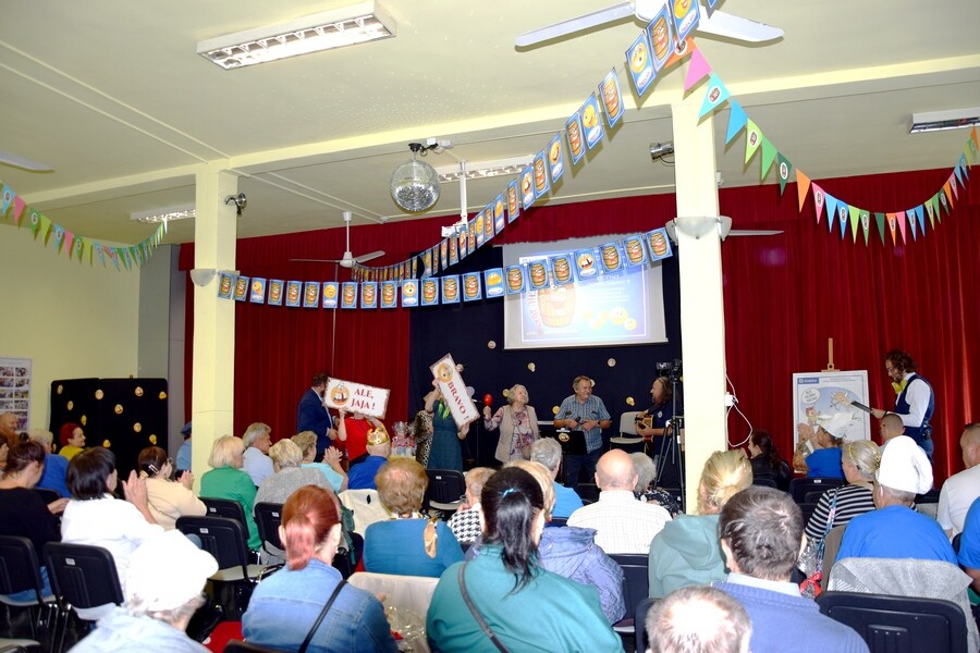 Po części oficjalnej uczestnicy biesiady obejrzeli program zatytułowany „Na komisariacie” w wykonaniu Grupy teatralnej „Babie lato. Spektakl ten otworzył naszą biesiadę, w której zaprezentowali się Mieszkańcy z dziewięciu Domów. Nasza trupa, czyli Państwo Kazimiera, Robert i Stanisław, pod opieką animatora kultury Pani Glorii, przedstawiła autorski program „Dworskie opowieści”. W ocenie jurorów był to najlepszy program „Beczki”. W tym miejscu z radością krzyczymy - Brawo My ! Teraz coś o nagrodach. Każdy z uczestników otrzymał kubek z mottem tegorocznej biesiady „ Uśmiechnij się ! Uśmiech to szczęście, które znajdziesz pod nosem” oraz słodki upominek, natomiast każdy Dom, pamiątkowy dyplom. Wydarzeniu towarzyszyła strefa małej gastronomii przygotowana przez naszą Kuchnię. „Beczkę” zakończyła wspólna zabawa prowadzona przez Pana Wojtka , naszego psychologa, który wraz z Panem Radkiem, na co dzień kierownikiem Działu Opiekuńczo-terapeutycznego, współprowadził wydarzenie. A teraz podziękowania. Pierwsze z nich kierujemy do Pana Mirosława Andrzejewskiego za serdeczność i zgodę na wykorzystania Jego pracy w szacie graficznej zaproszenia, plakatu, pamiątkowego dyplomu i kubka. Kolejne podziękowania pragniemy przekazać naszym Przyjaciołom z Krakowskiego Centrum Seniora Dom nr 1, ul. Sas Zubrzyckiego 10 za pełne humoru, cud – przedstawienie. Wyrazy podziękowania przekazujemy wszystkim Uczestnikom biesiady za ogromną dawkę humoru, bez którego nasze życie byłoby z pewnością mniej kolorowe i mniej energetyczne.