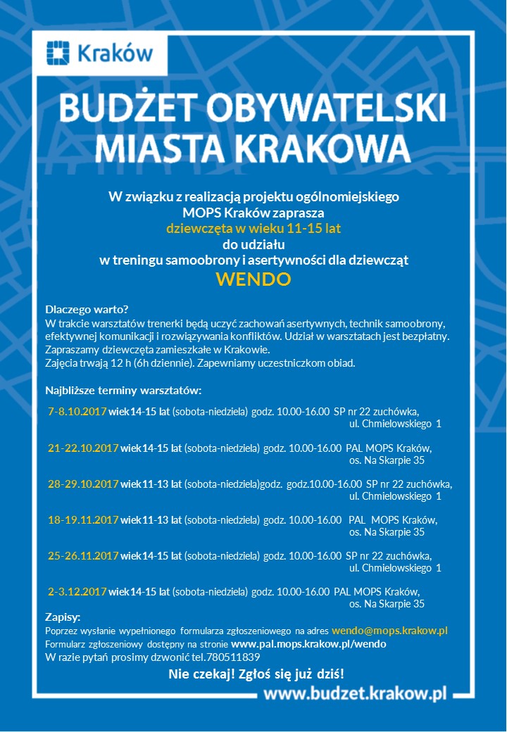 Dzięki głosom krakowianek i krakowian w III Edycji Budżetu Obywatelskiego w 2016 roku Miejski Ośrodek Pomocy Społecznej w Krakowie realizuje warsztaty samoobrony i asertywności dla dziewcząt WenDo.